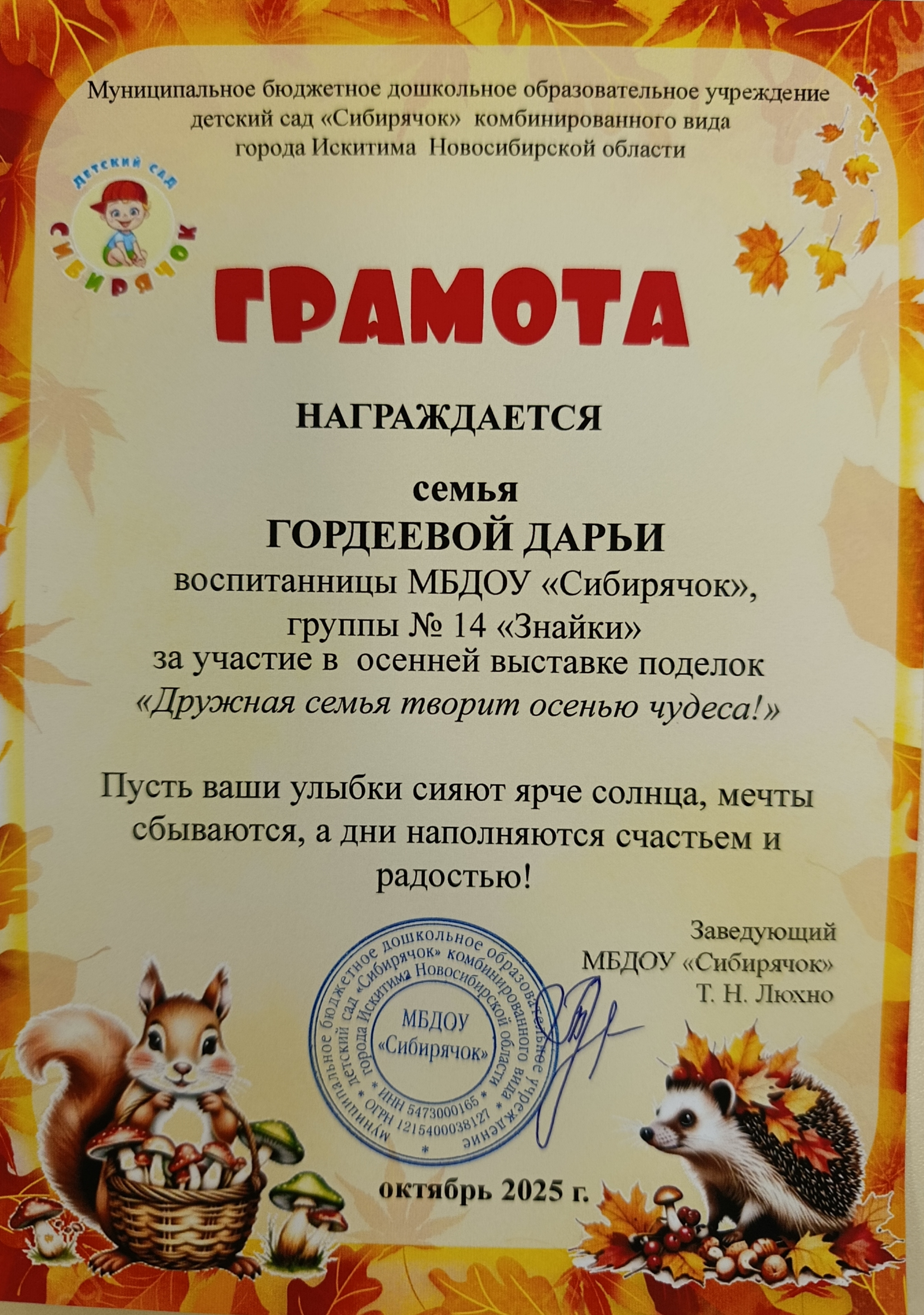 Награждение детей грамотами за творческие работы, и участие в выставке "Дружная семья творит осенью чудеса"