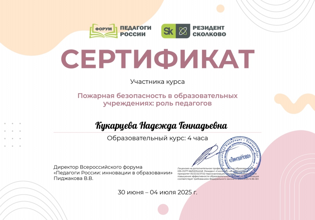 СЕРТИФИКАТ участника курса "Пожарная безопасность в образовательных учреждениях: роль педагогов. 30.06.2025 - 04. 07.2026г., 4 часа.