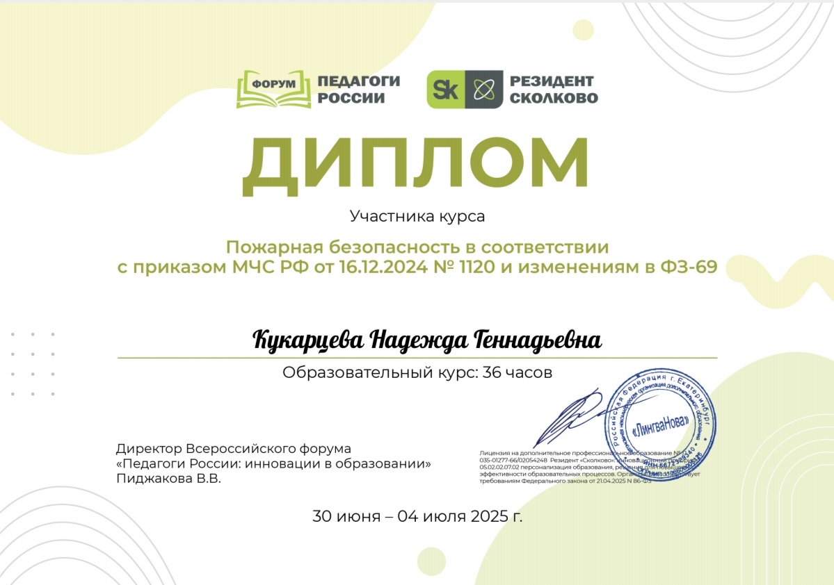 Диплом участника курса "Пожарная безопасность в соответствии с приказом МЧС РФ" 36 часов, 30.06.2025 - 04.07. 2025г.