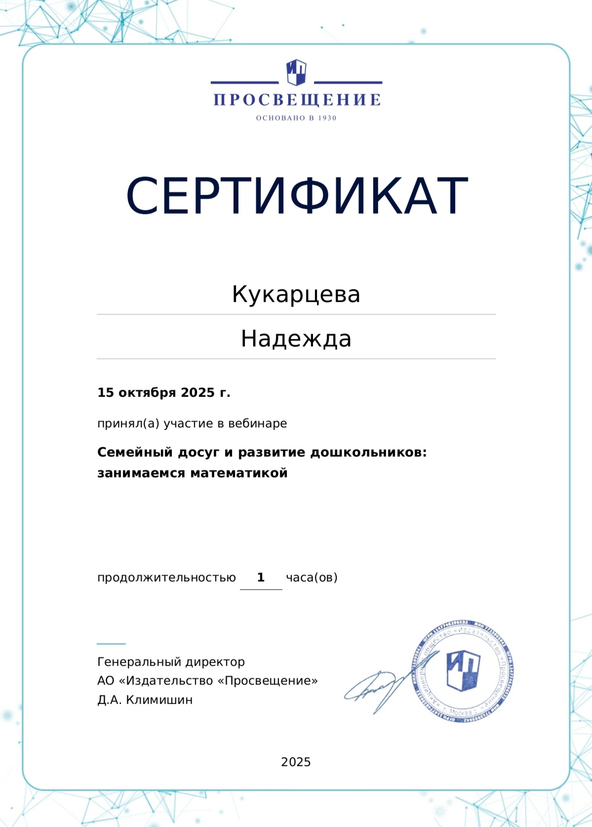 СЕРТИФИКАТ участия в вебинаре "Семейный досуг и развитие дошкольников: занимаемся математикой". АО "Издательство" Просвещение" 15.10.2025г.